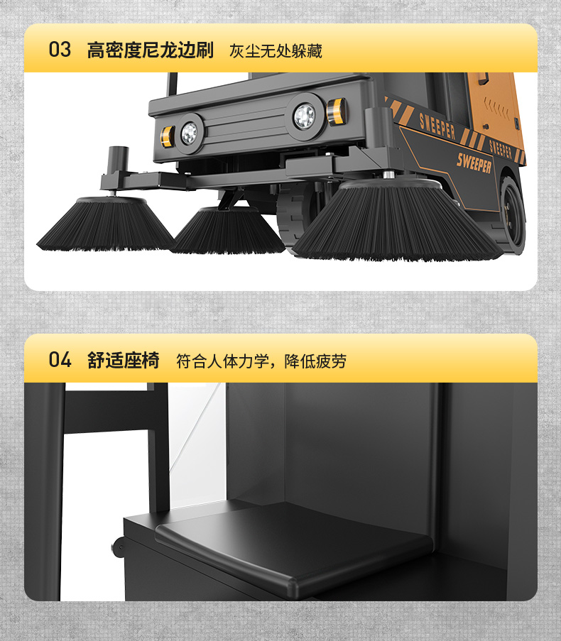 榮事達RS-CAR180 駕駛式掃地機配備了風扇,無需擔心夏季長時間戶外使用時的高溫問題。方向盤操作更加靈活方便,配備了舒適座椅,提升了人性化需求。腳剎和警示燈設計提升了操作的安全性能。榮事達RS-CAR180 駕駛式掃地機采用全封閉設計,防塵防雨,避免了在戶外操作過程中的很多問題,一次充電,可以超長續航,避免了反復充電的問題,噴霧設計解決了清掃過程中粉塵過大的問題。